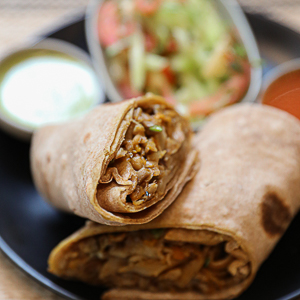 Mushrooms cooked with onions, tomatoes, potatoes and herbs wrapped in brown roti served with fresh tomato & cucumber salad and our special tomato sauce and mint chutney. The price includes 5% VAT and a 10% service charge will be added.